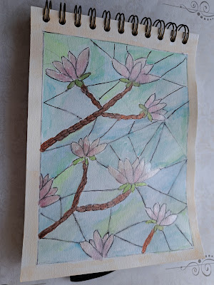 I drew these magnolias imitating stained glass. I used blue and green watercolors for the glass background.