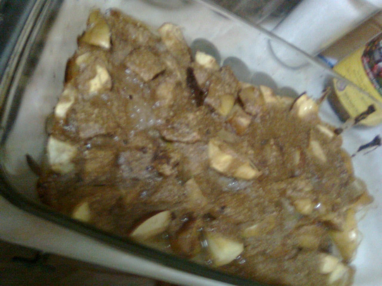 Lavei algumas maçãs e cortei em cubos até cobrir o fundo. Polvilhei canela por cima. Numa taça juntei um pouco de farelo de aveia, uma caneca de farinha integral, duas canecas de leite de aveia, um pouco de azeite e meia caneca de açucar mascavado. Misturei tudo muito bem e dsepejei por cima das maçãs. Levei ao forno médio durante 45 minutos.